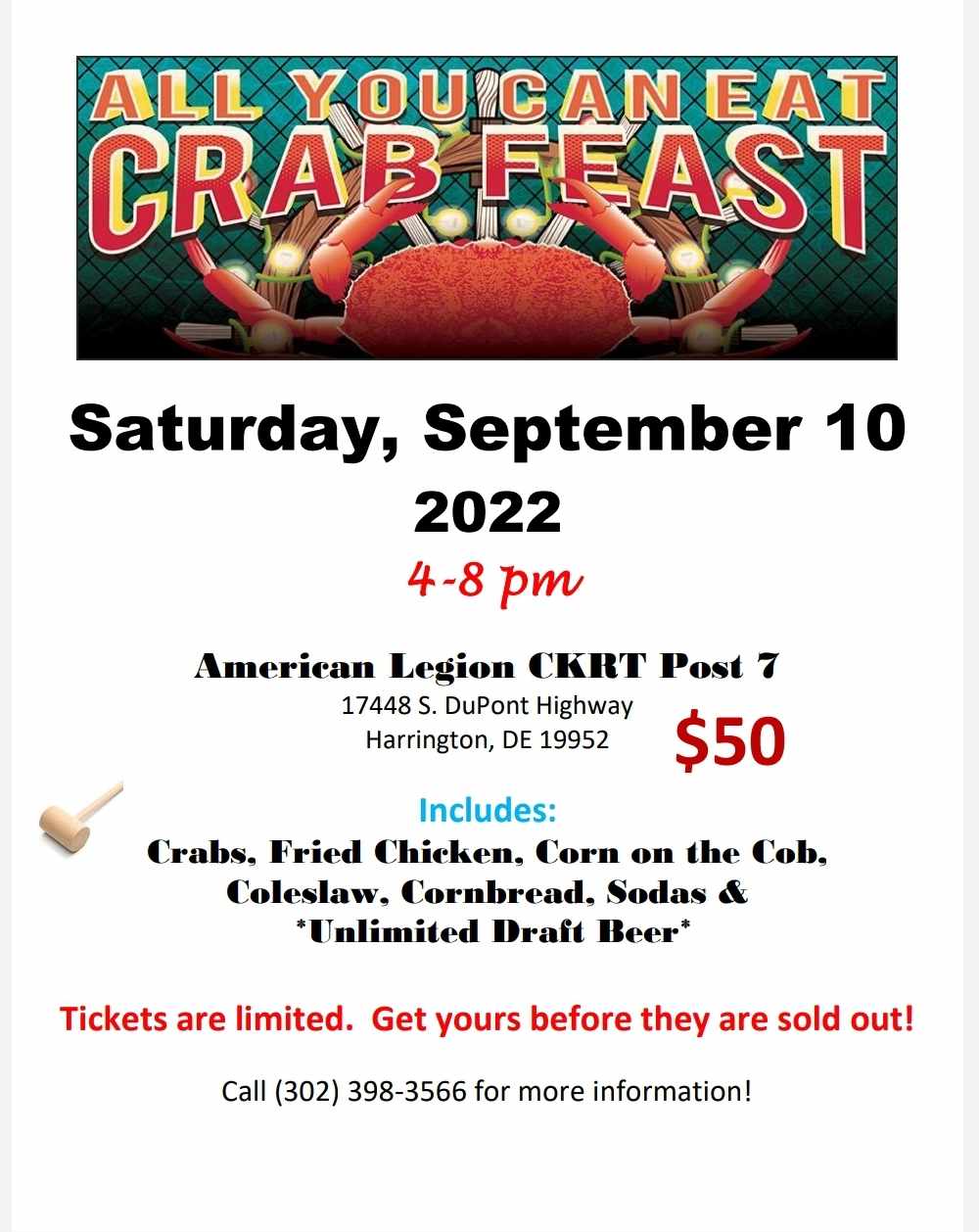 American Legion Post 7 In Harrington Will Be Hosting Its Annual All You Can Eat Crab Feast On Saturday September 10th. It Starts At 4 P.M. And Ends At 8 P.M. There Will Be Crabs, Fired Chicken, Corn On The Cob, Cole Slaw, Cornbread, Soda And Unlimited Draft Beer All Included!